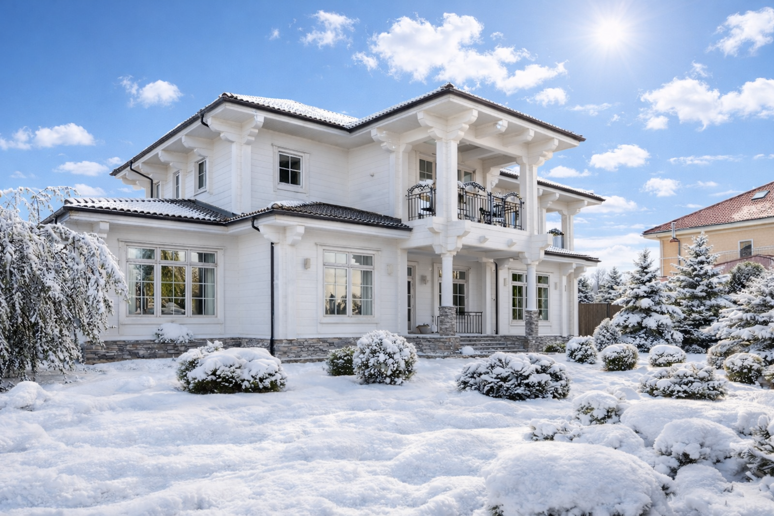 — Клеёный брус камерной сушки из северной древесины. Натуральный, экологичный материал — без клеёв с формальдегидом. Не трескается, не коробится, не требует перекрасов. Сохраняет геометрию и эстетику на десятилетия.